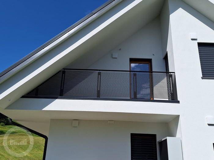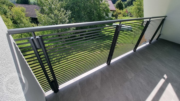 Zgoraj je zaključena z ročajem izdelanim iz najkvalitetnejše ALU zlitine ter dodatno zaščitenim z barvo kovinskega videza. Ograja se montira direktno na čelo balkona.