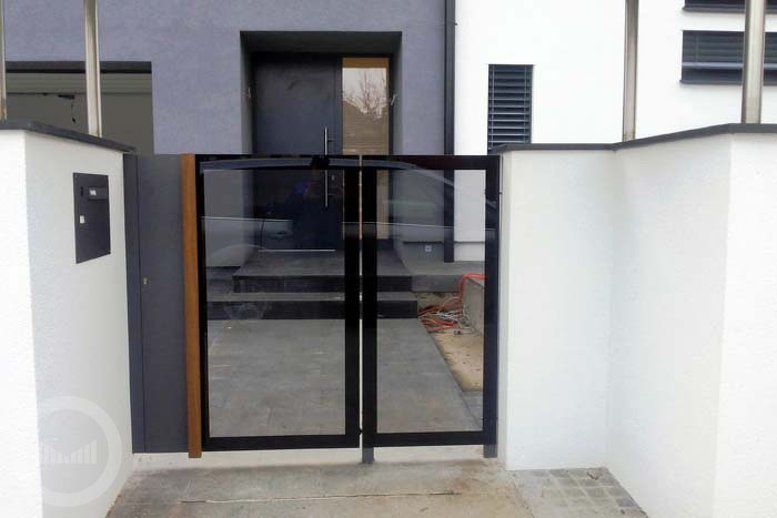Panelna dvoriščna vrata predstavljajo najnovejši ograjni sistem in so izdelana iz aluminija (konstrukcija) in VSG transparentnega stekla.