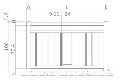 Ograja je sestavljena iz pokončnih palic, dimenzije 2 x 2 cm, zgoraj zaključena z ročajem.