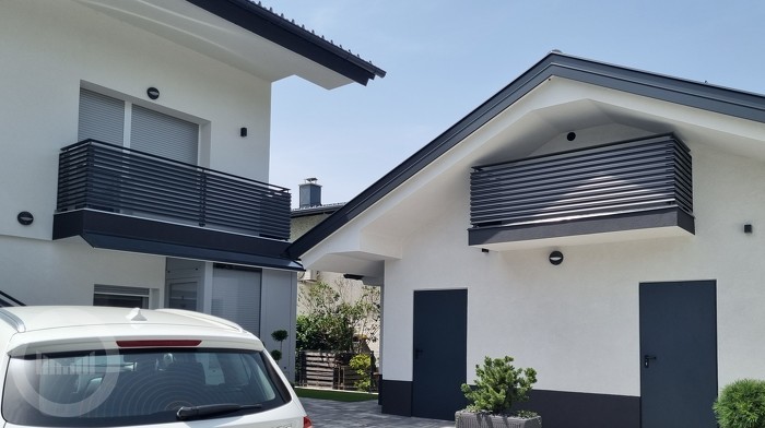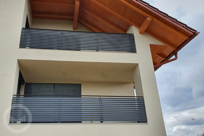 Ograja je sestavljena iz vodoravnih aluminijastih letev s profilom »R« višine 70 mm, debeline 30 mm.