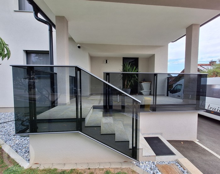 Ograjo sestavljajo elementi iz VSG parsol stekla, debeline 4 mm + 4 mm, ki je sive barve. Vmes je nalepljena varnostna folija.