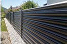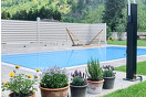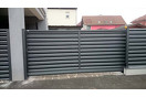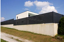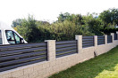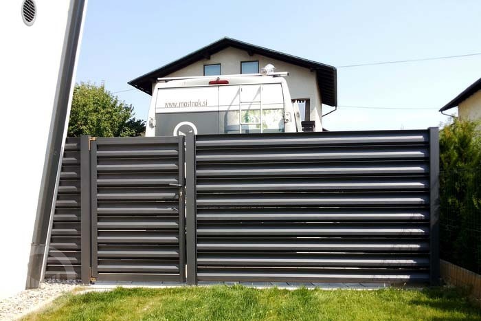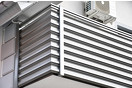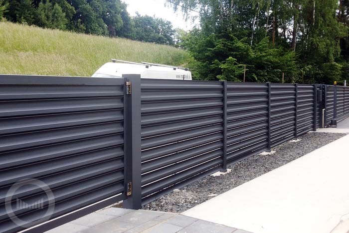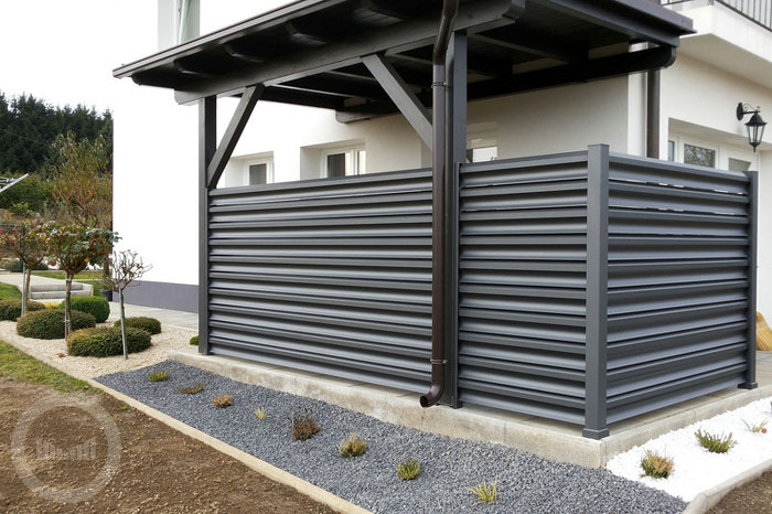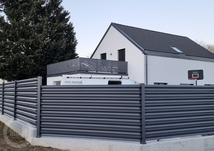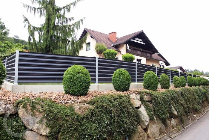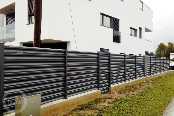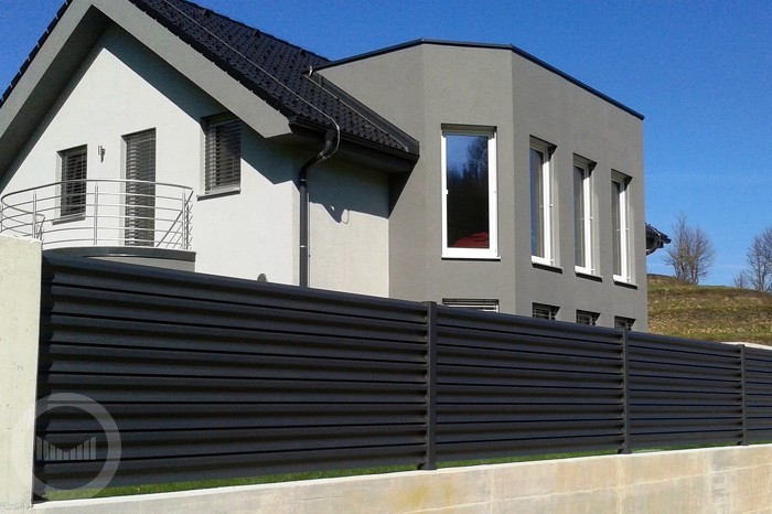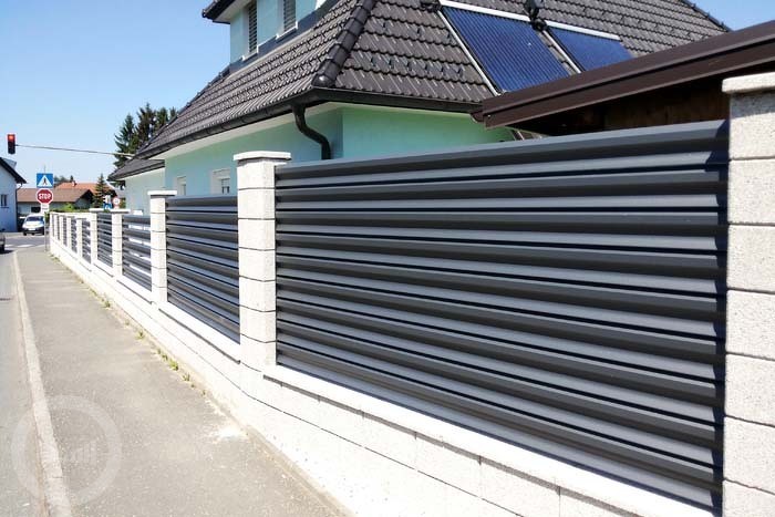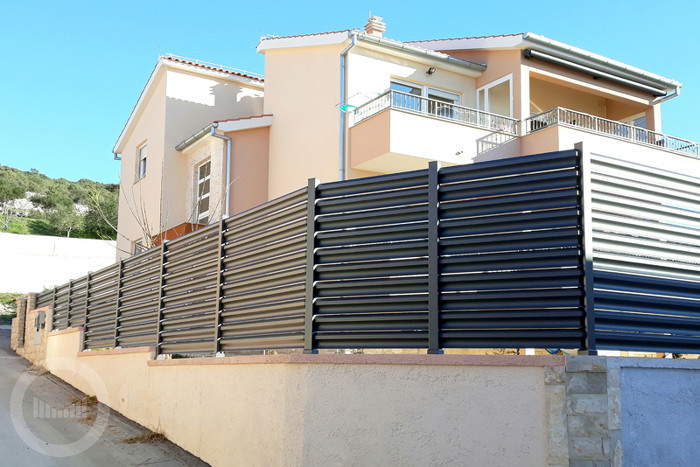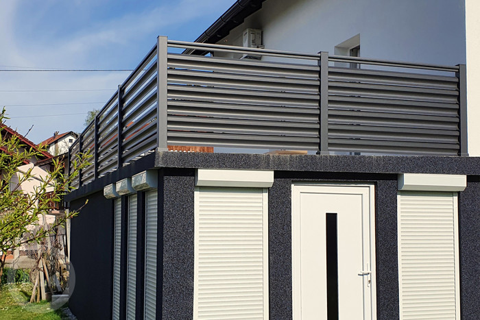 Ograja je sestavljena iz vodoravnih aluminijskih letev s profilom »S« višine 145 mm, debeline 30 mm.